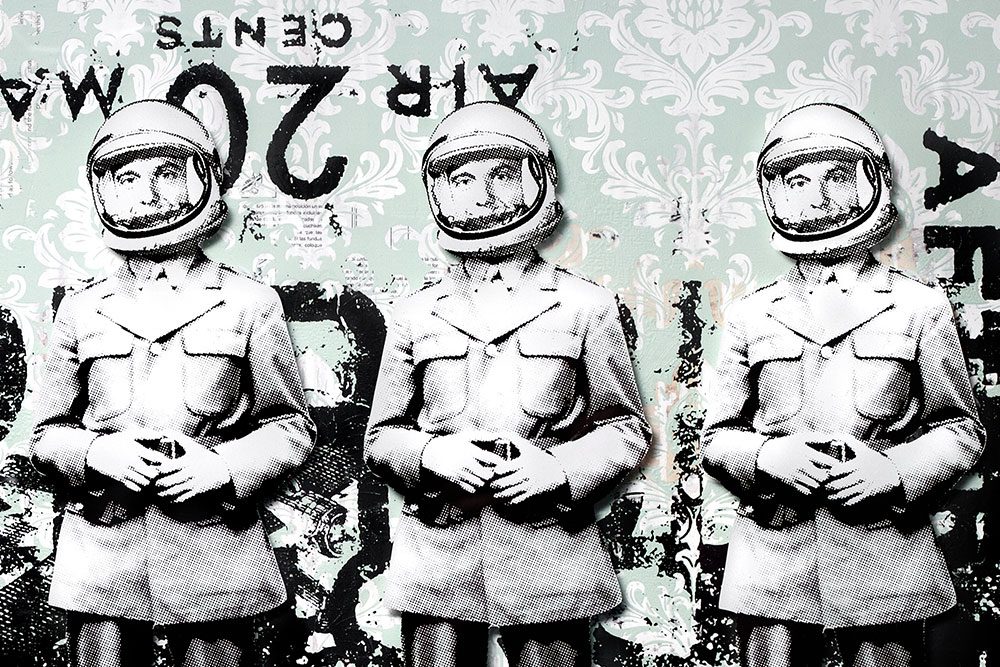 Two color screen printed acrylic plexiglass mounted on top of a two color screen printed, hand painted and collaged 24″x24″ wood panel – signed on the back.