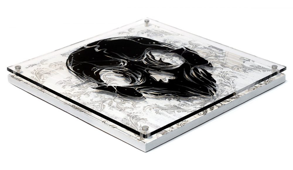 One color screen printed acrylic plexiglass mounted on top of a one color screen printed, hand painted and collaged 12”x12” wood panel. Signed and dated on the back.