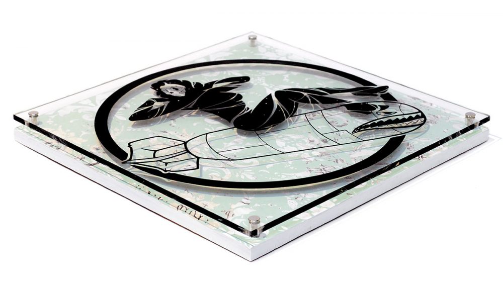 One color screen printed acrylic plexiglass mounted on top of a one color screen printed, hand painted and collaged 12”x12” wood panel. Signed and dated on the back.