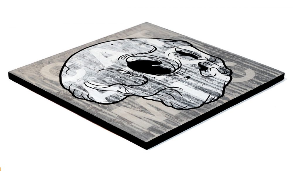 Three color screen print on a 12”x12” wood panel with hand painting and emulsion transfer. Signed and dated on the back.