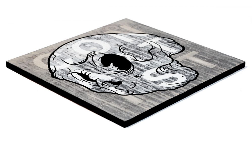 Three color screen print on a 12”x12” wood panel with hand painting and emulsion transfer. Signed and dated on the back.