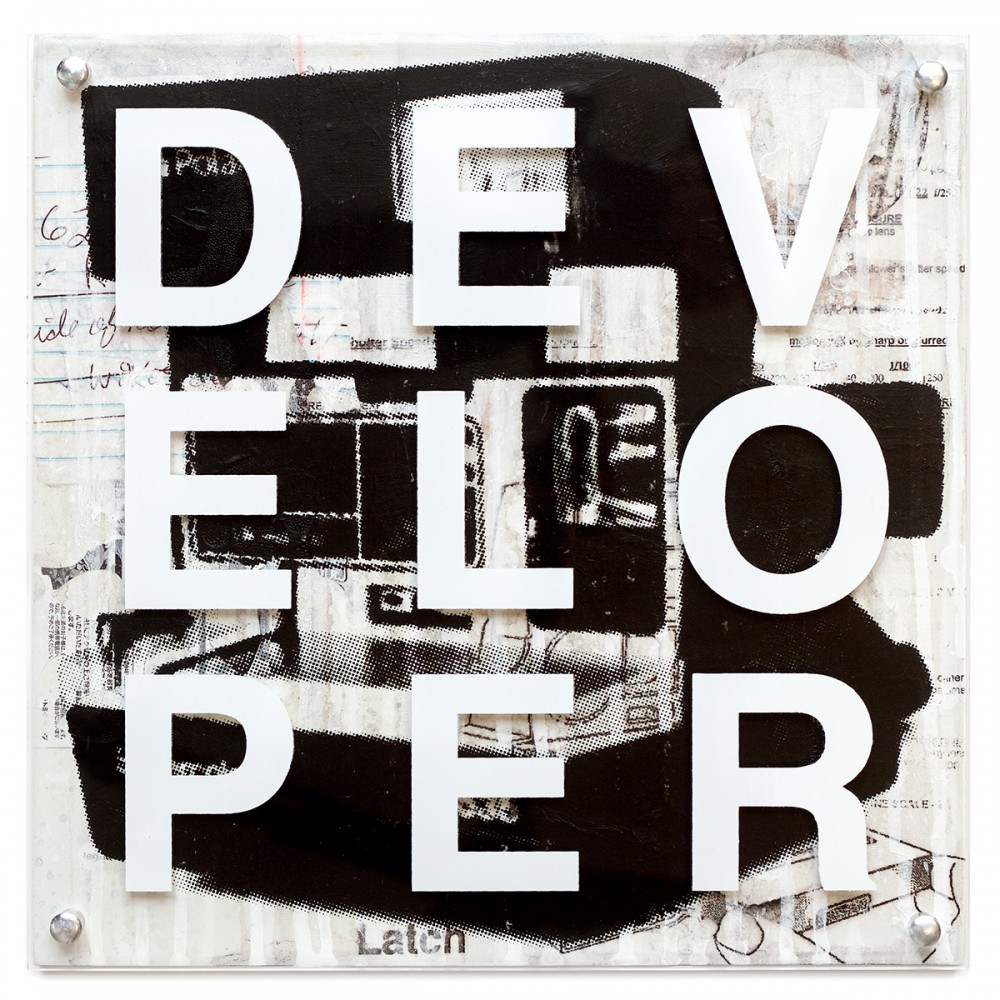 One color screen printed acrylic plexiglass mounted on top of a one color screen printed, hand painted and collaged 12″x12″ wood panel – signed on the back.