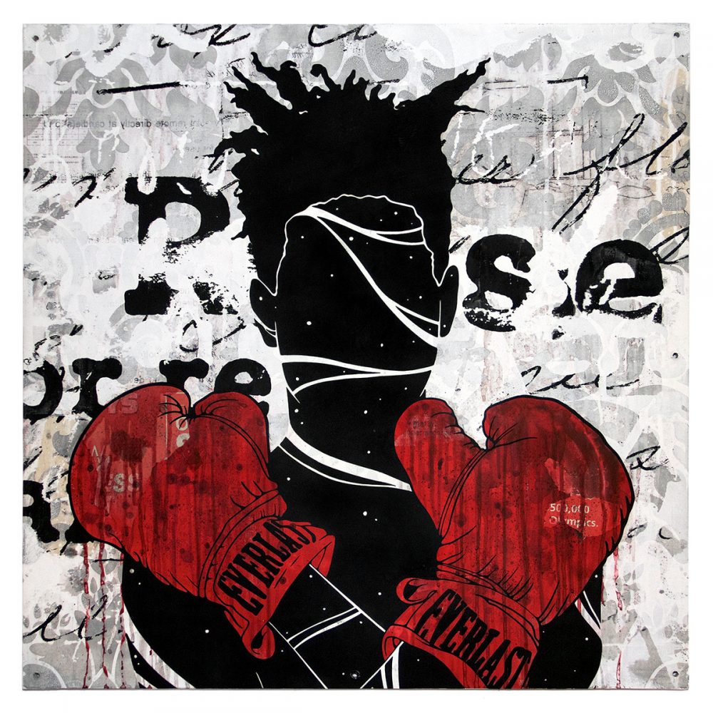 Five color screen printed, hand painted and collaged 24”x24” wood panel with a 24”x24” with acrylic plexiglass mounted on top. Signed and dated on the back.