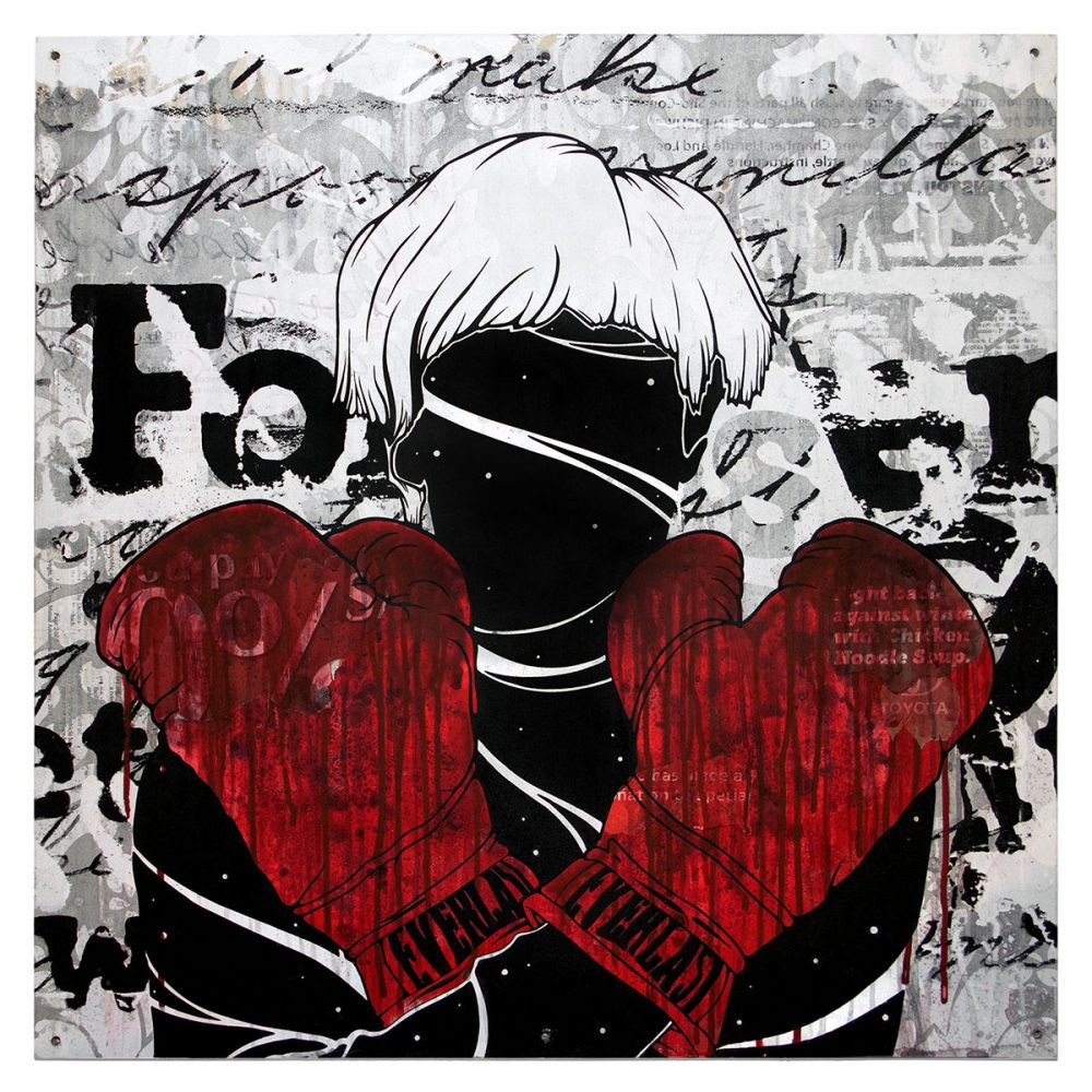 Five color screen printed, hand painted and collaged 24”x24” wood panel with a 24”x24” with acrylic plexiglass mounted on top. Signed and dated on the back.