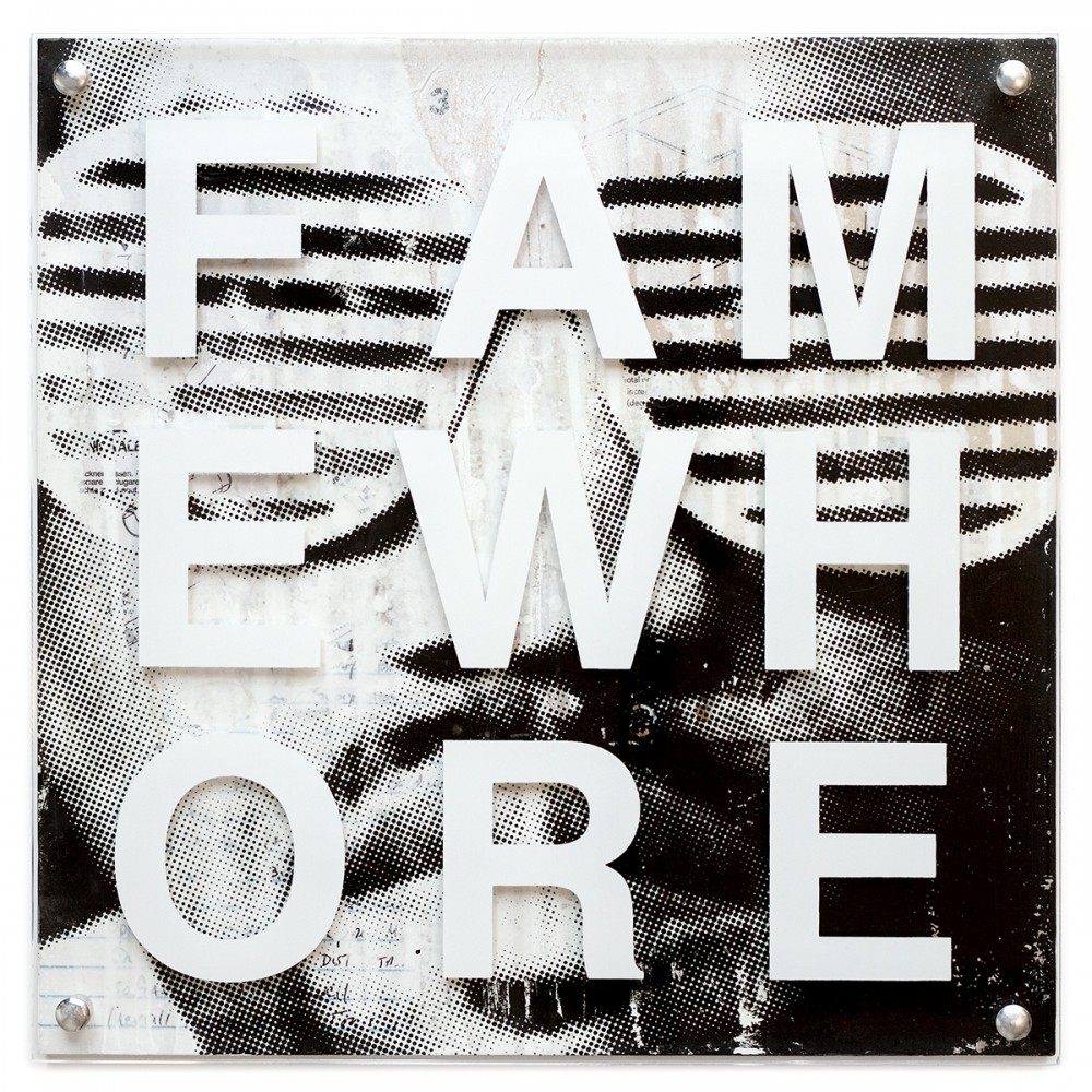 One color screen printed acrylic plexiglass mounted on top of a one color screen printed, hand painted and collaged 12″x12″ wood panel – signed on the back.