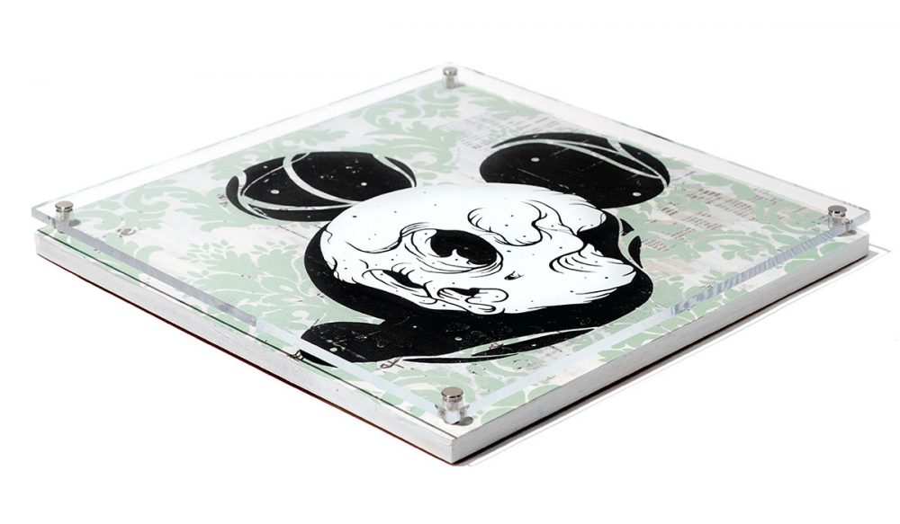 One color screen printed acrylic plexiglass mounted on top of a two color screen printed, hand painted and collaged 12”x12” wood panel. Signed and dated on the back.