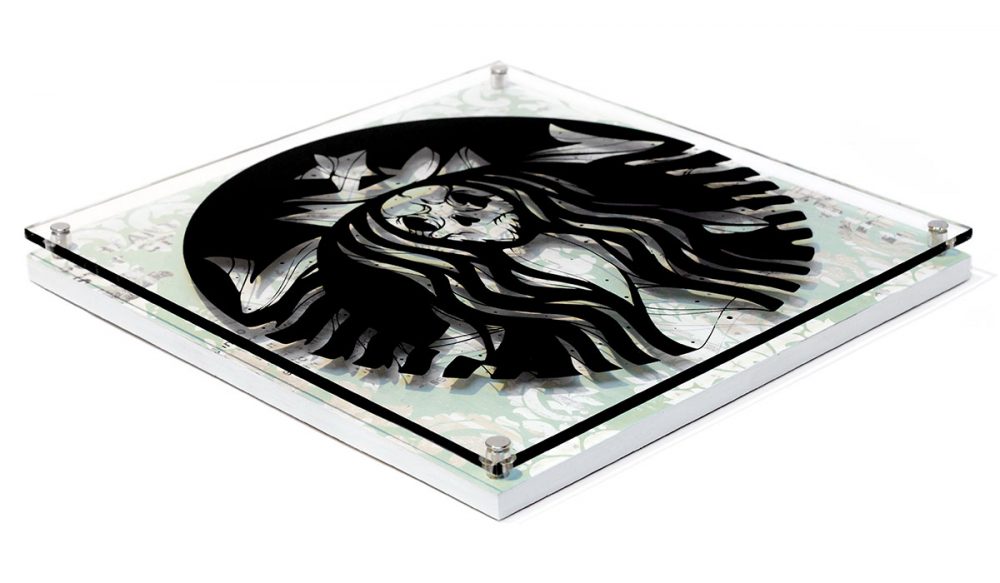 One color screen printed acrylic plexiglass mounted on top of a one color screen printed, hand painted and collaged 12”x12” wood panel. Signed and dated on the back.