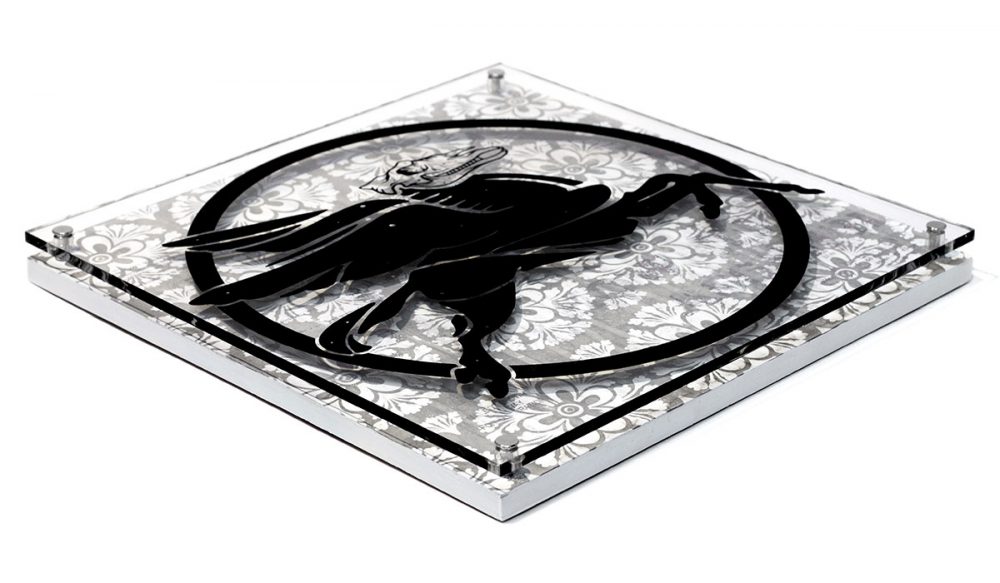 One color screen printed acrylic plexiglass mounted on top of a one color screen printed, hand painted and collaged 12”x12” wood panel. Signed and dated on the back.