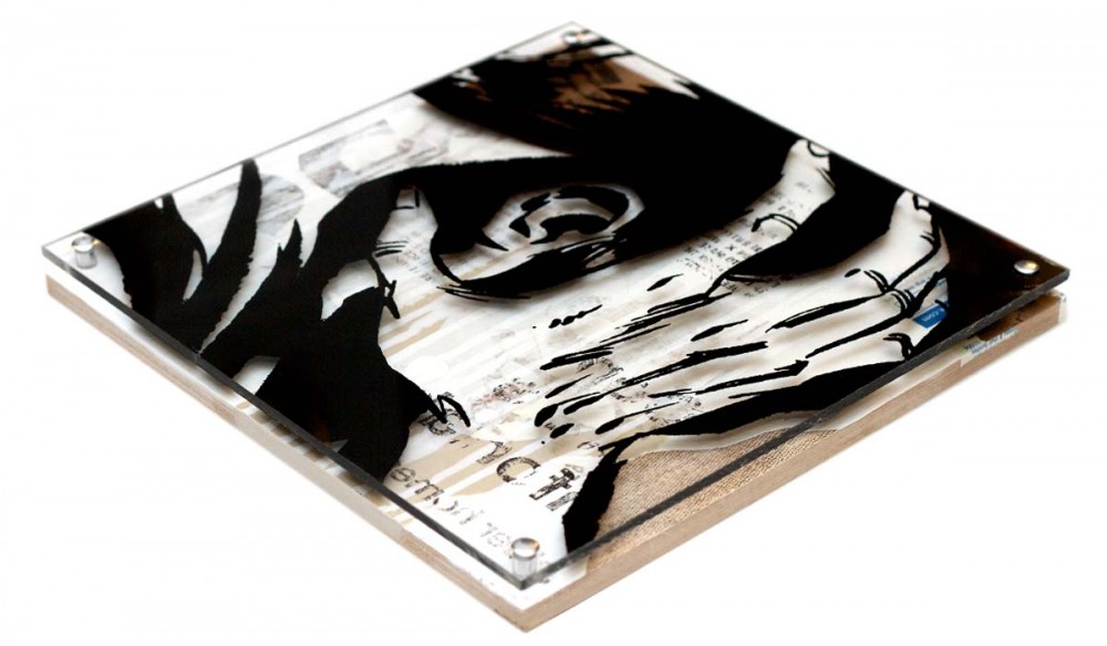 Each piece is 12″x12″ screen print on plexiglass that is mounted above a hand painted, emulsion transfer and collaged wood panel – each image is a unique edition of 3 and is signed and numbered on the back.